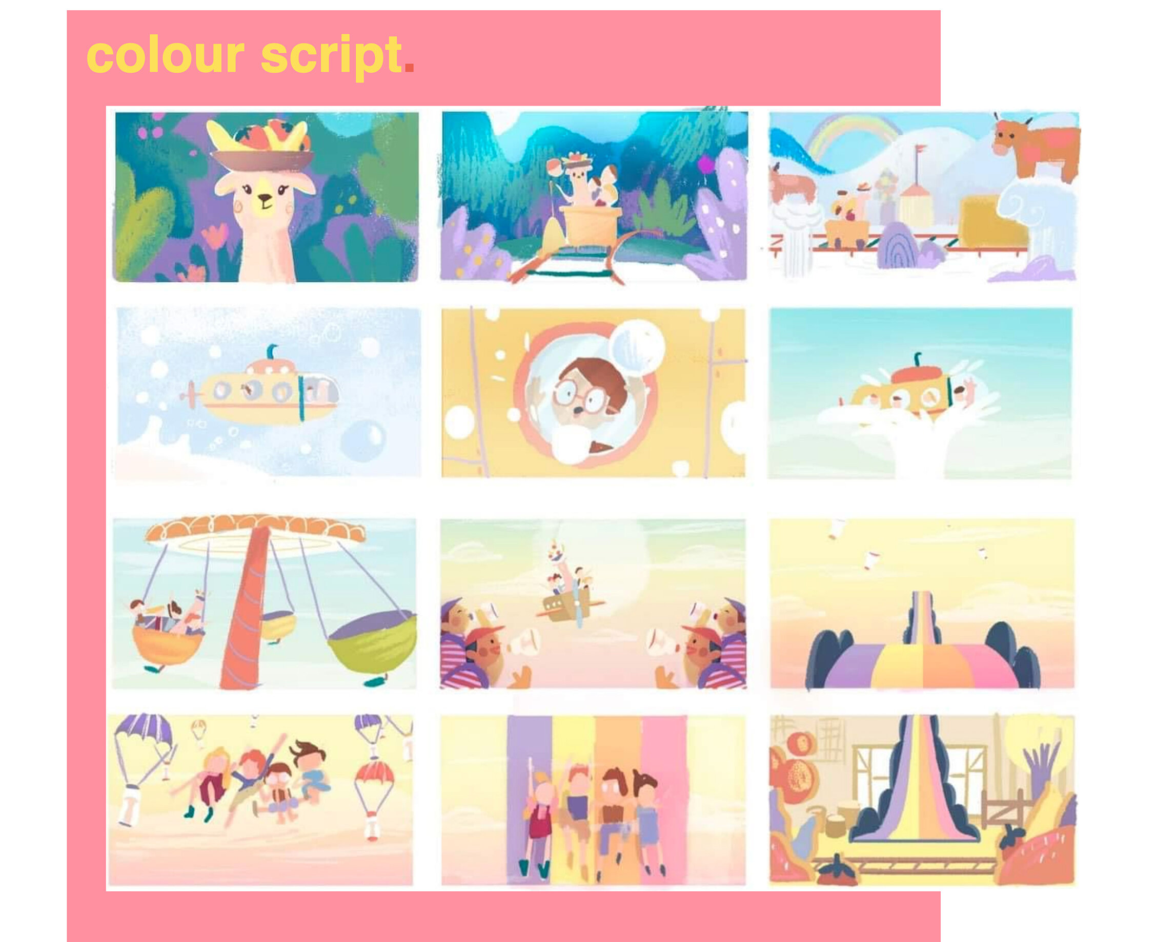 The magical world of yoghurt making had feel bright, exciting and delicious. Here some steps towards conceiving that with colour script, styleframes and details.